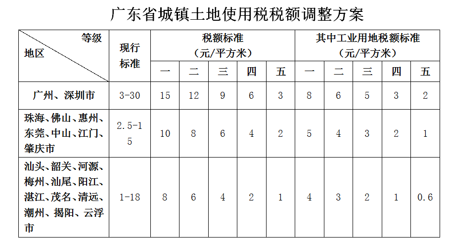 《廣東省人民政府關于降低制造業企業成本支持實體經濟發展若干政策措施》(粵府〔2017〕90號)提出,“在國家規定的稅額幅度內,降低城鎮土地使用稅適用稅額標準”。廣東省財政廳、原廣東省地方稅務局為了進一步降低企業稅收負擔,根據《中華人民共和國城鎮土地使用稅暫行條例》《廣東省城鎮土地使用稅實施細則》,在國家規定的稅額幅度內適當調整全省各地城鎮土地使用稅適用稅額標準(見《廣東省城鎮土地使用稅稅額調整方案》)。