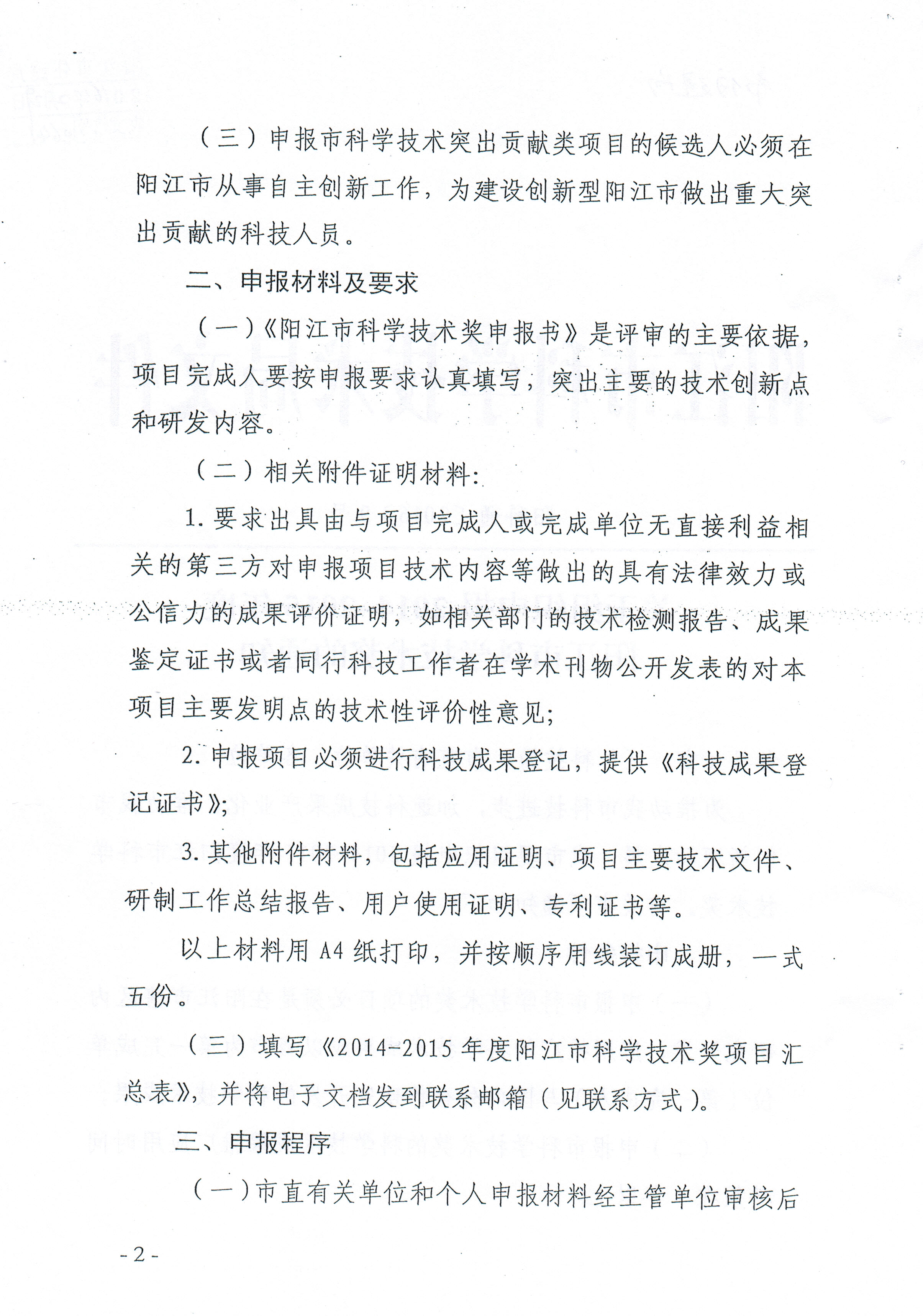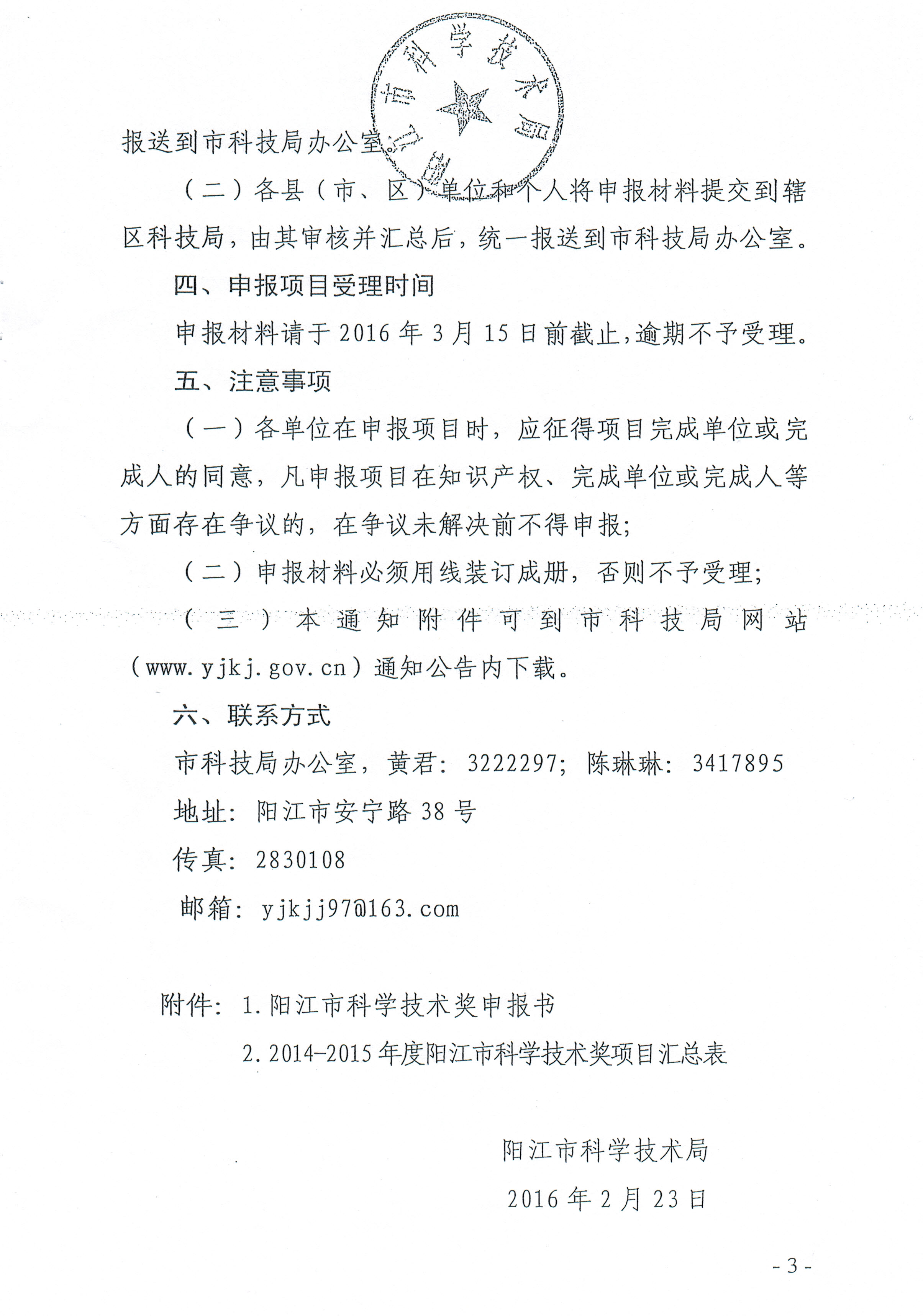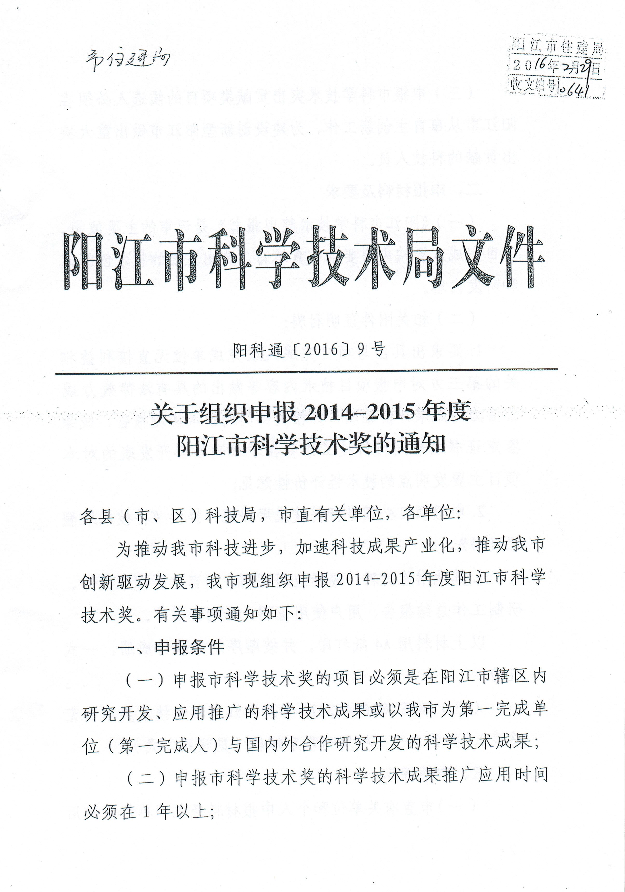 根據市科技局《關于組織申報2014-2015年度陽江市科學技術獎的通知》(陽科通〔2016〕9號)要求,請符合申報條件的有關單位按要求組織申報材料,于3月10日前將報送我局科技教育科。