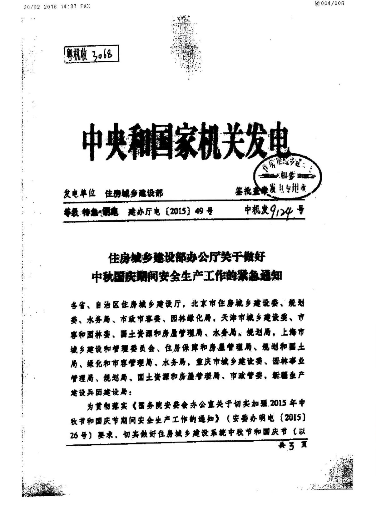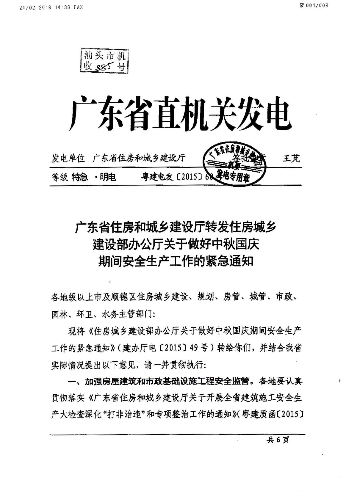 現(xiàn)將《廣東省住房和城鄉(xiāng)建設(shè)廳轉(zhuǎn)發(fā)住房城鄉(xiāng)建設(shè)部辦公廳關(guān)于做好中秋國(guó)慶期間安全生產(chǎn)工作的緊急通知》(粵建電發(fā)﹝2015﹞60號(hào))轉(zhuǎn)發(fā)給你們,請(qǐng)遵照?qǐng)?zhí)行。